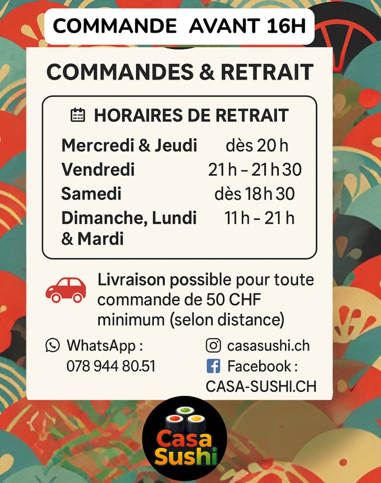 Sushis frais · Faits maison · Commande avant 16 h